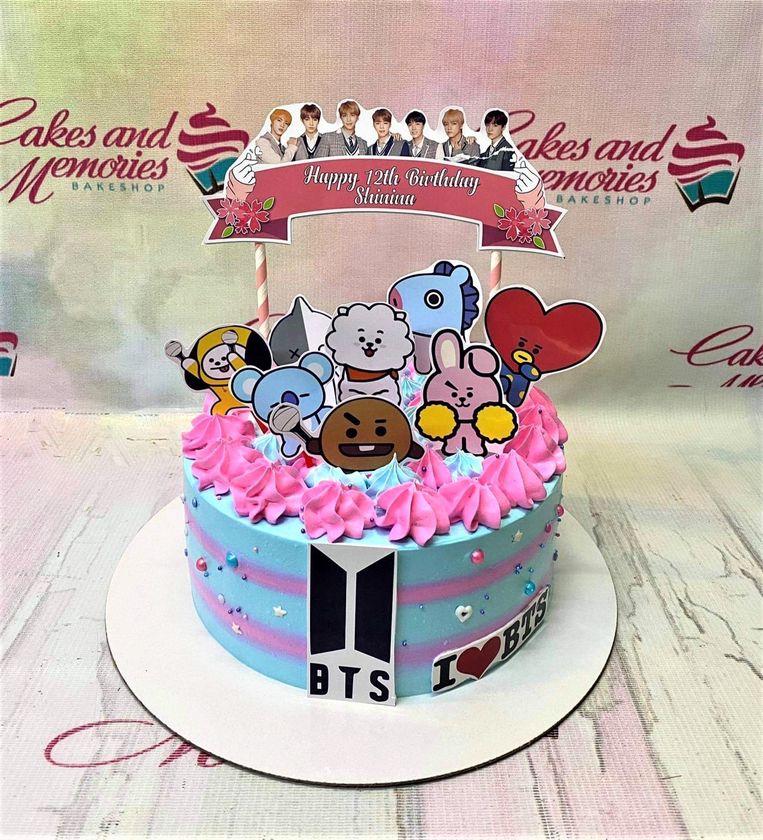 BTS themed birthday cake with blue and pink striped icing, pink rosettes, and various BT21 character printout toppers.