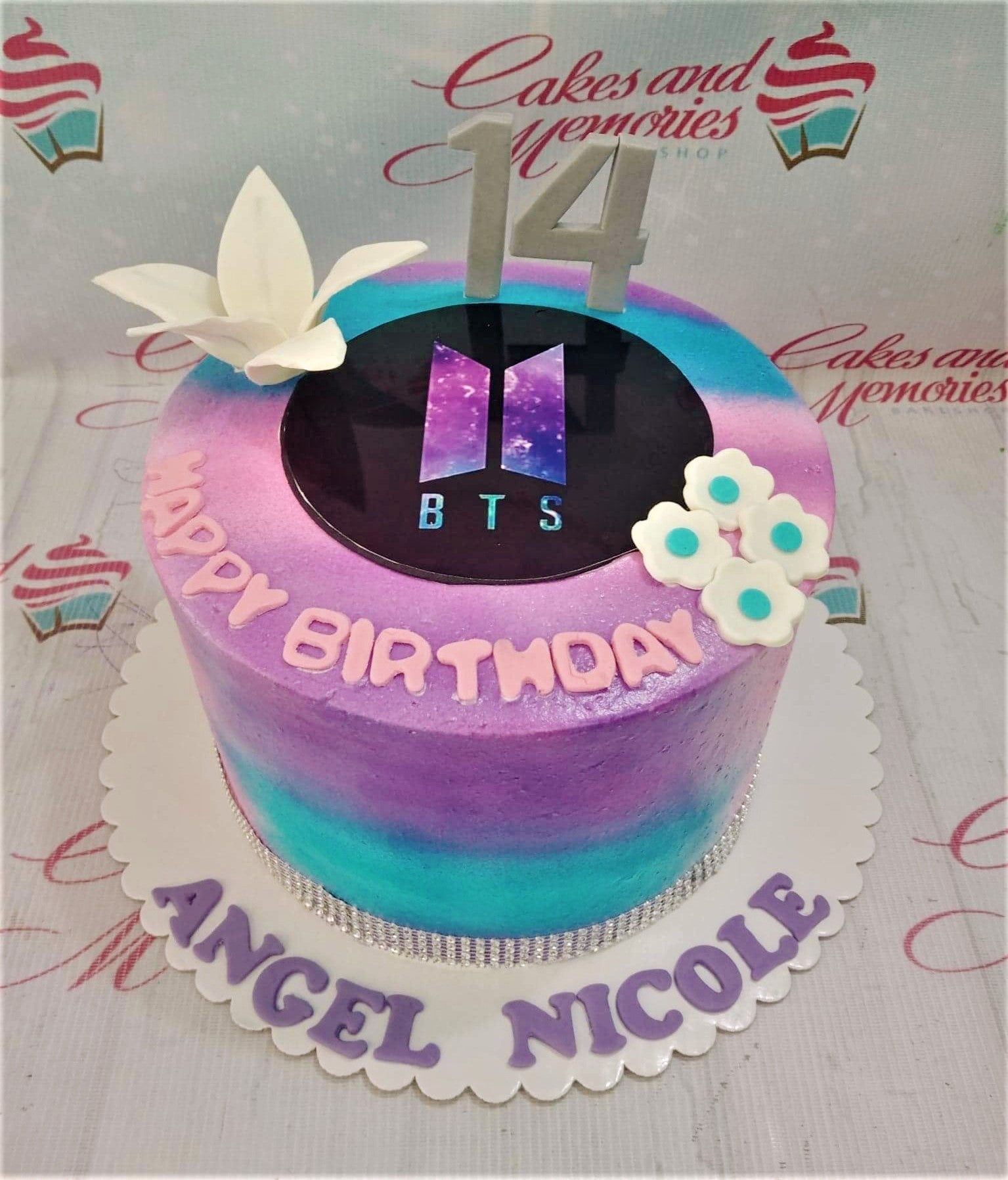 Purple and blue gradient BTS themed birthday cake with a 14th birthday topper and white fondant flowers.
