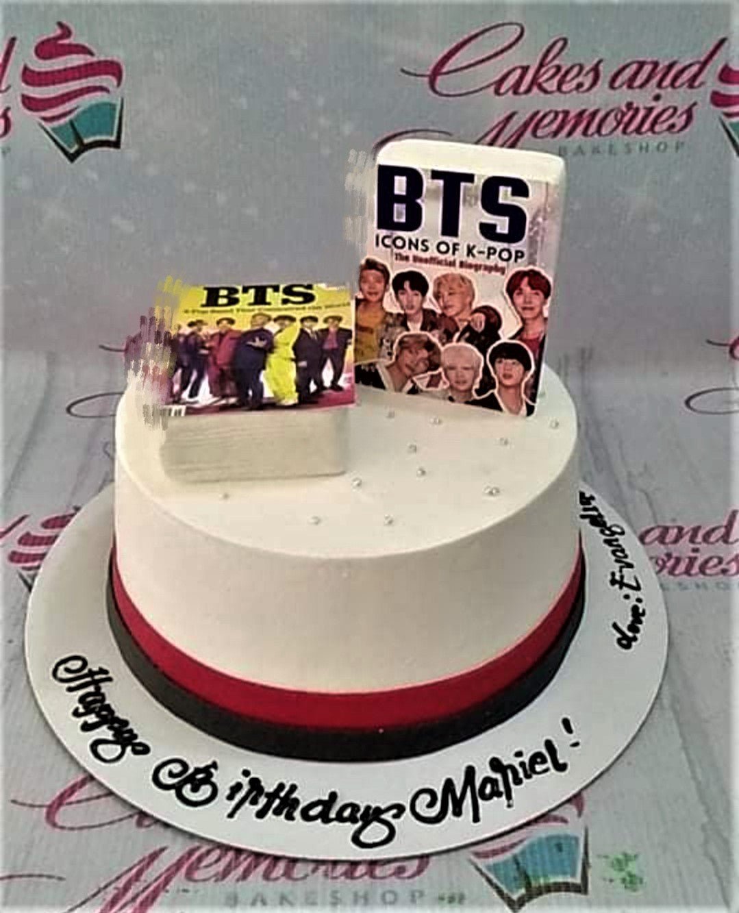 White BTS K-pop themed birthday cake with printed book-style toppers and red and black base borders.