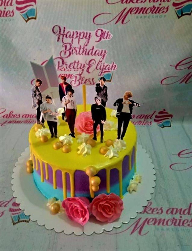 BTS K-pop themed birthday cake with yellow drip icing, purple and blue gradient base, and printed character toppers.