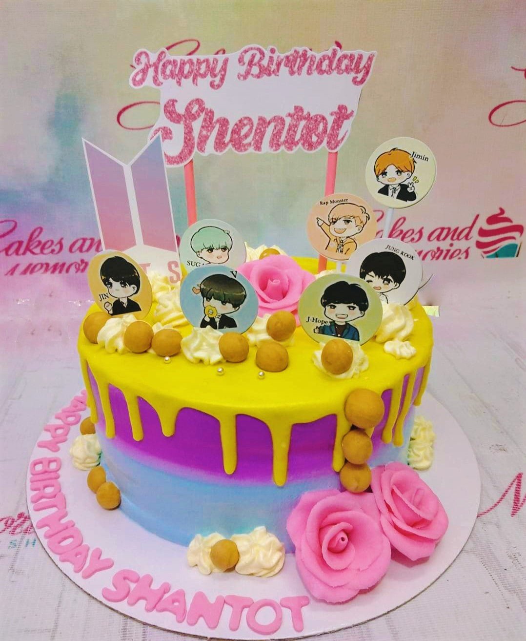 BTS K-pop themed birthday cake with yellow and purple gradient icing, yellow drip, and character printouts.