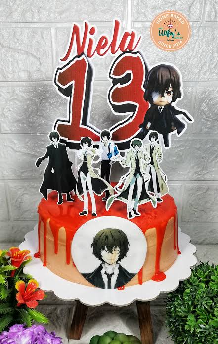 Bungo Stray Dogs themed birthday cake with Osamu Dazai character printouts and red drip icing on a tan base.