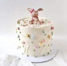 Cream colored single tier cake with a hand-sculpted brown bunny topper and delicate pastel piped icing flowers on the sides.