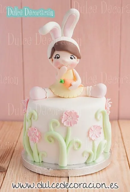 White fondant cake featuring a 3D edible girl figure in a bunny costume with pink flowers and green vines on the side.