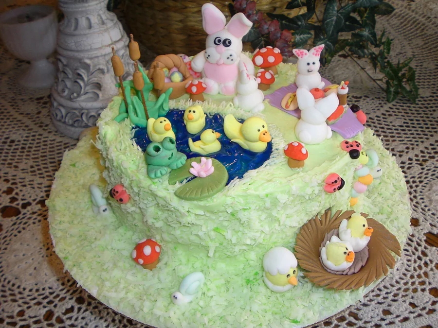 A whimsical nature-themed cake featuring a green coconut-shredded base with fondant bunnies, ducks in a blue pond, a frog, and mushrooms.