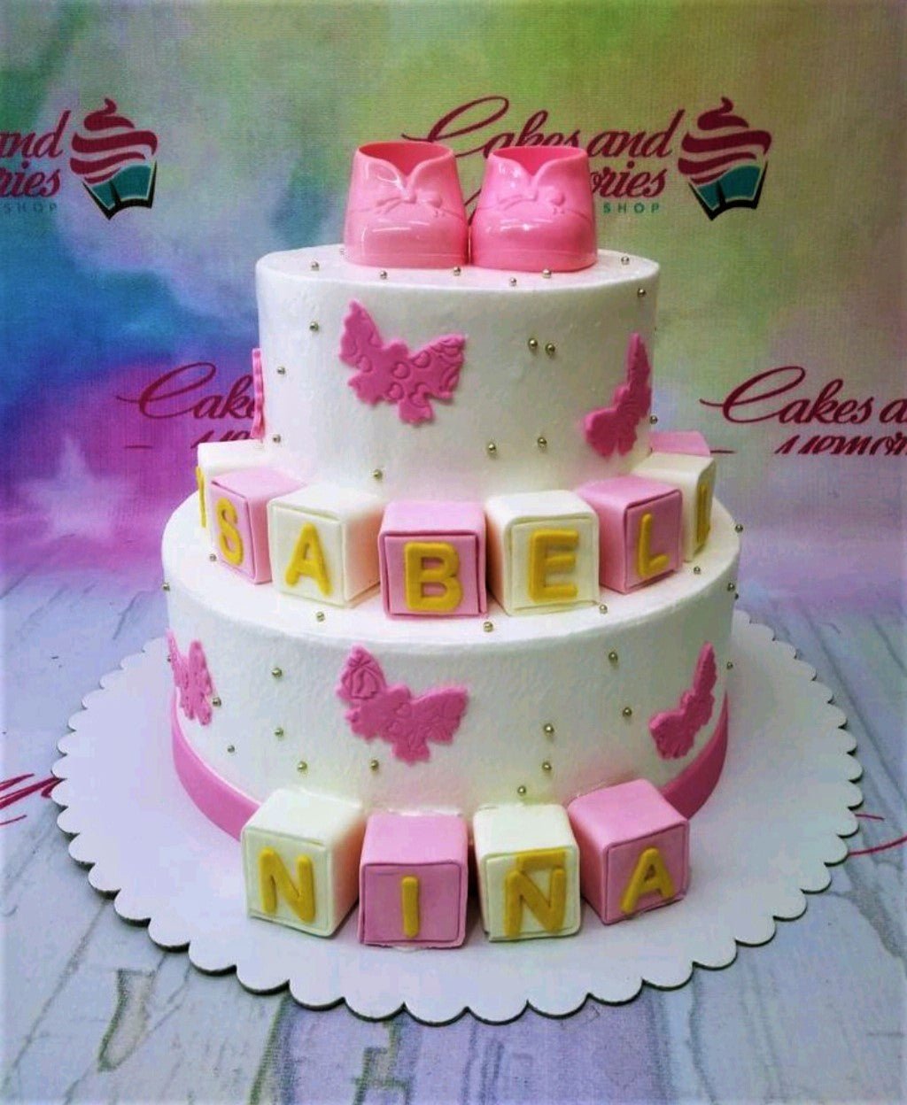 Two-tier white cake with pink fondant butterflies, gold dragees, and pink and white name blocks for Isabel Nina.