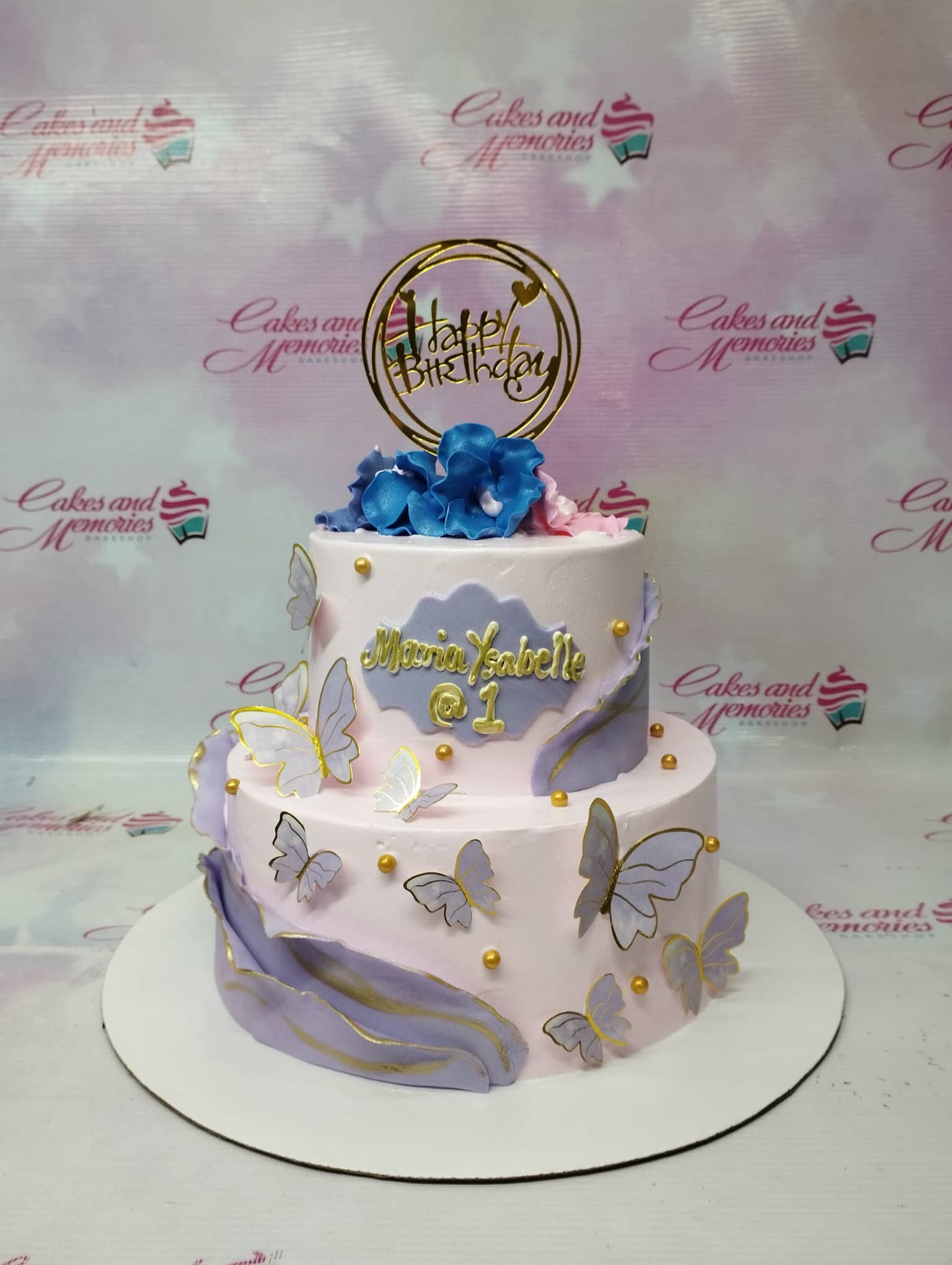 Two-tier light pink birthday cake with purple fondant drapes, gold butterflies, and a blue floral topper.