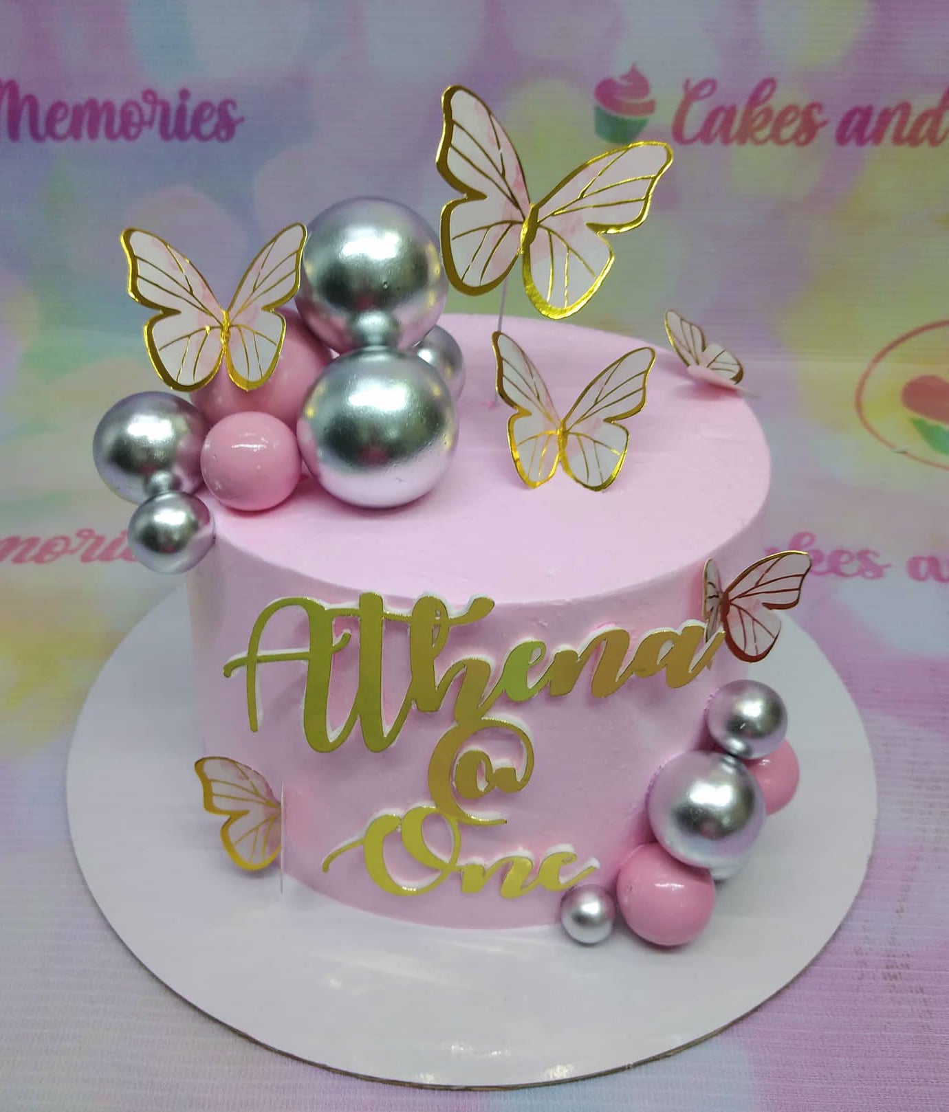 Pink round cake with gold butterfly toppers, silver and pink decorative balls, and a gold Athena @ One message.