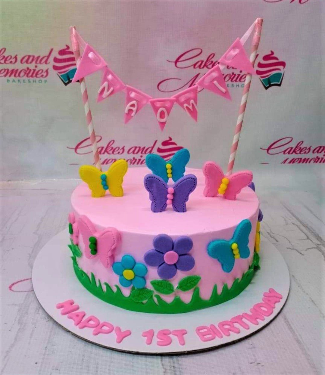 Pink butterfly and flower birthday cake with a pink banner topper and colorful fondant decorations.