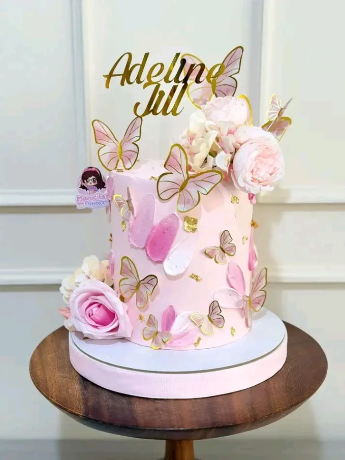 Tall pink 1-tier cake with gold acrylic name topper, pink roses, and gold-edged butterfly decorations.