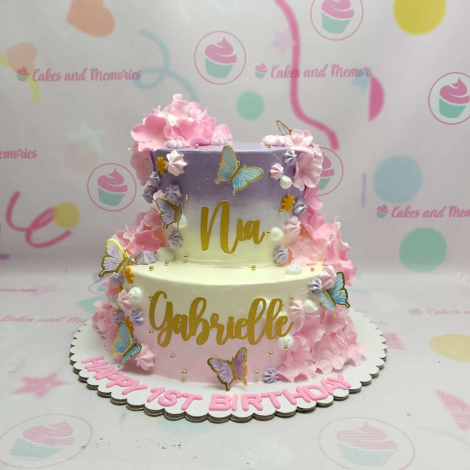 Two-tier ombre purple and pink cake with gold name toppers, butterflies, and pink icing flowers.