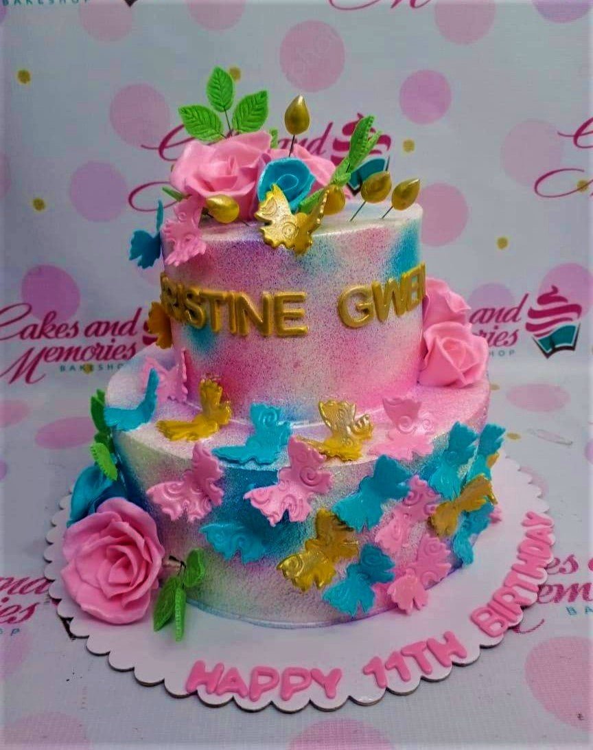Two-tier butterfly and rose birthday cake with pink, blue, and purple gradient icing and gold butterfly accents.