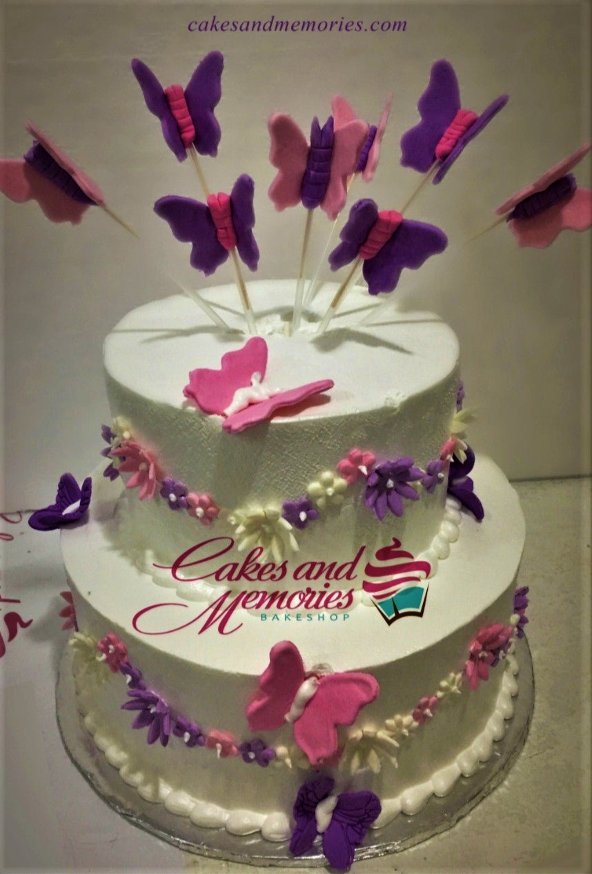 Two-tier white soft-icing cake decorated with pink and purple fondant butterflies and flowers.