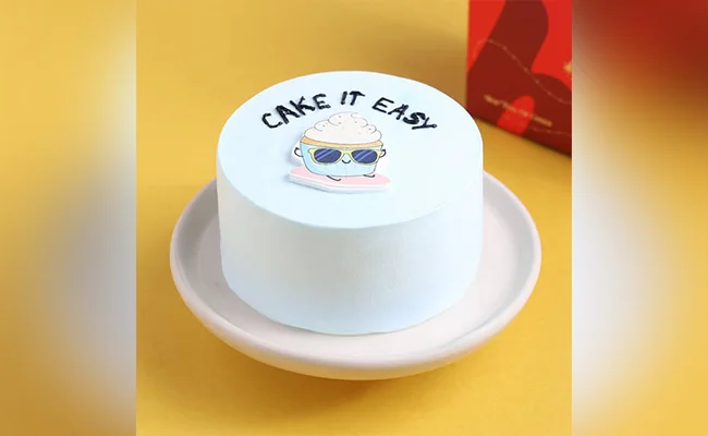 Light blue bento cake with a printed cupcake character wearing sunglasses and the message Cake It Easy in black icing.