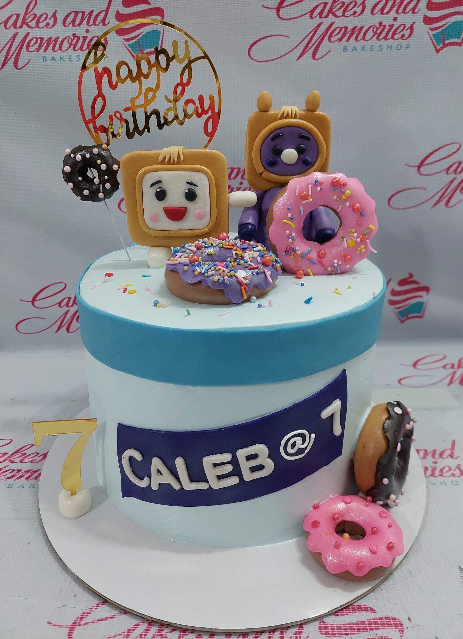 Light blue 1-tier birthday cake featuring edible 3D character figures, colorful donuts, and a gold Happy Birthday topper.
