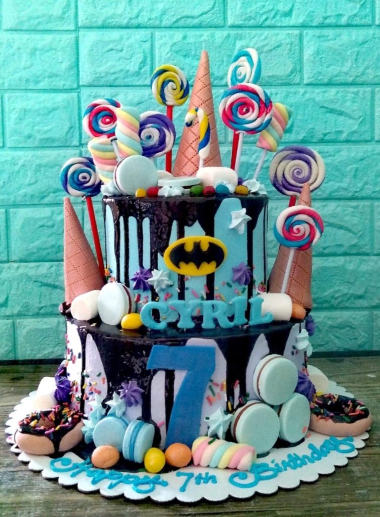 Colorful 2-tier candy-themed birthday cake with chocolate drip, lollipops, macarons, and Batman logo for Cyril's 7th birthday.