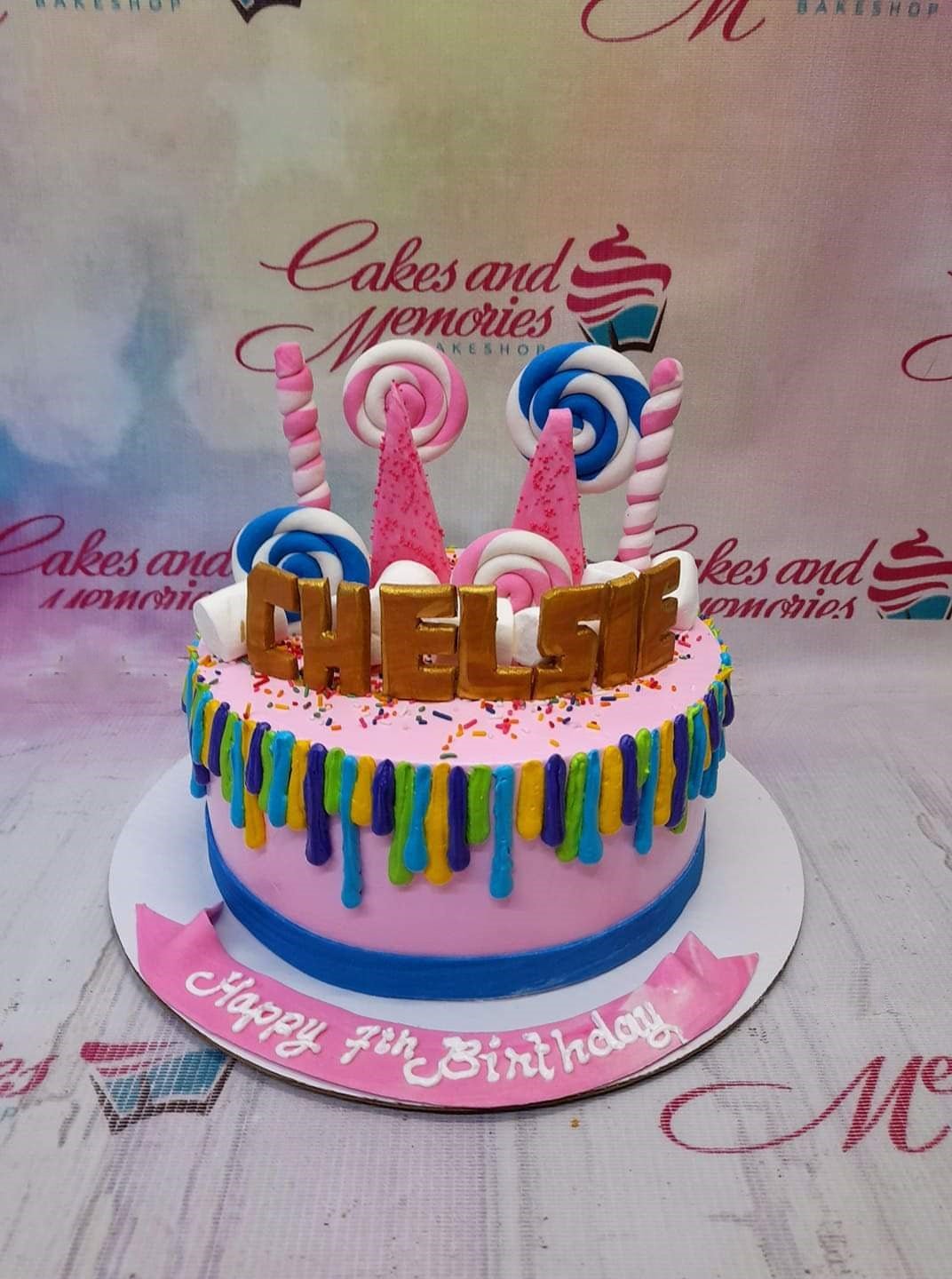 Pink birthday cake with colorful icing drips, gold gumpaste letters spelling CHELSIE, and various candy-themed toppers.