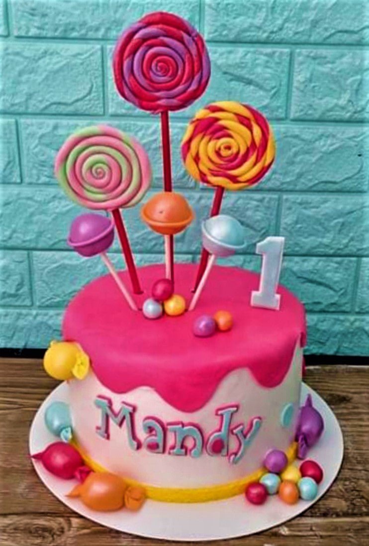 Pink fondant cake with a hot pink drip, topped with colorful fondant lollipops and candies for a first birthday celebration.