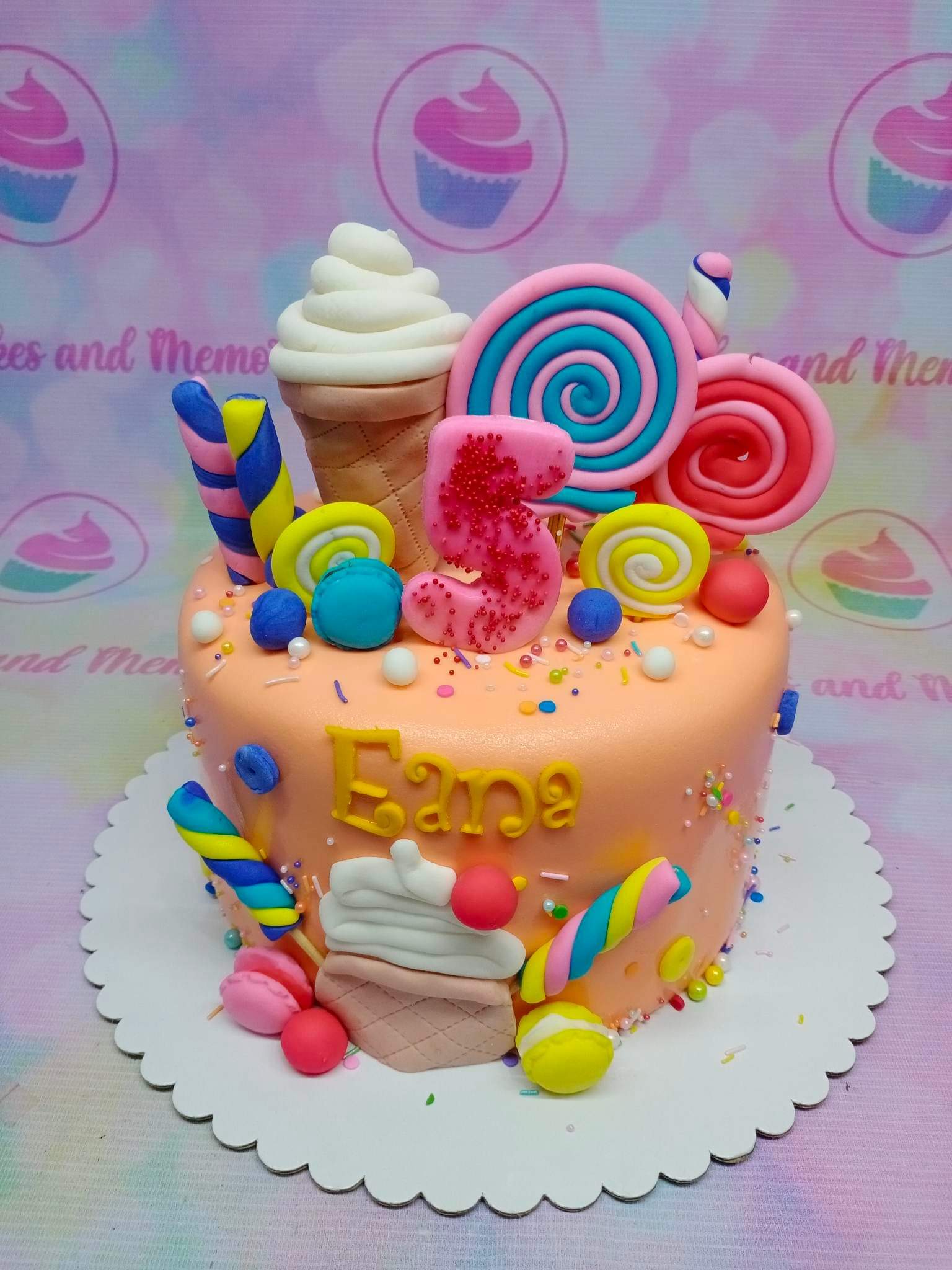 Peach-colored candy-themed birthday cake with fondant lollipops, ice cream cones, macarons, and a pink glittery number 5 topper.