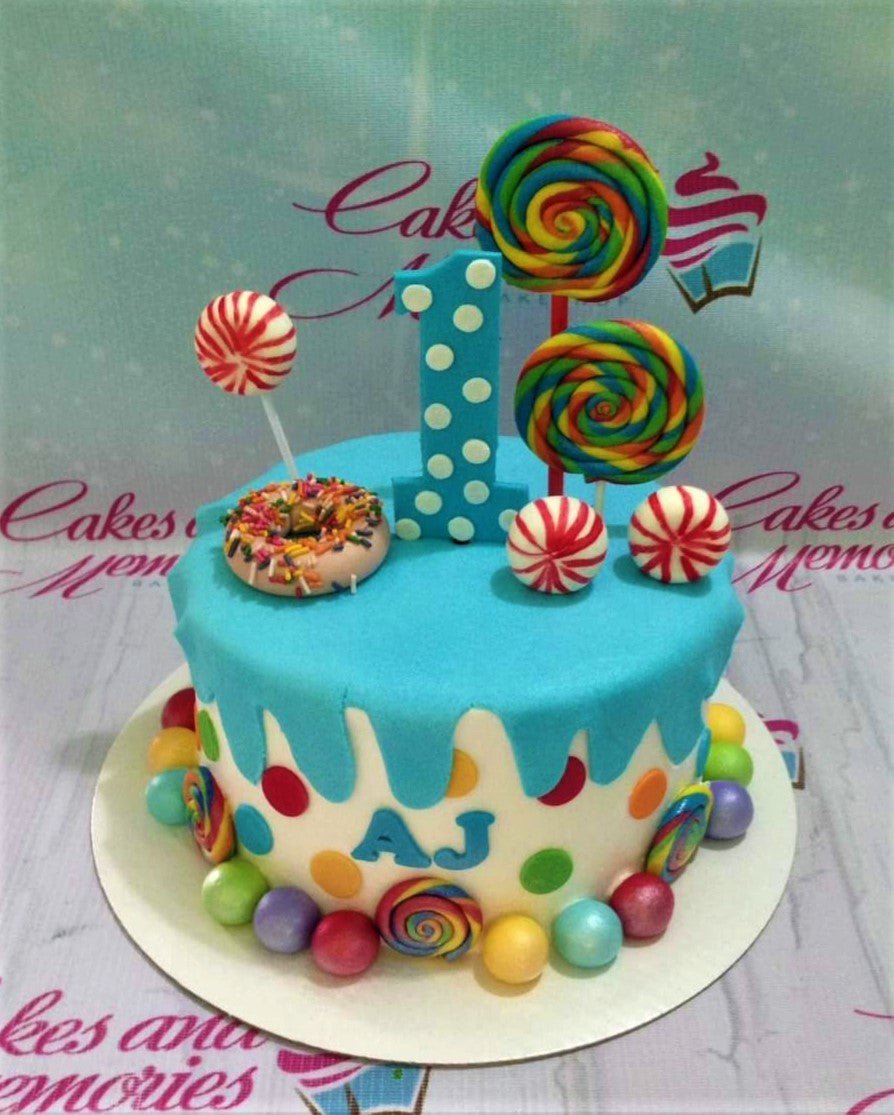 Colorful candy-themed first birthday cake with a blue fondant drip, lollipops, a donut, and a large number one topper.