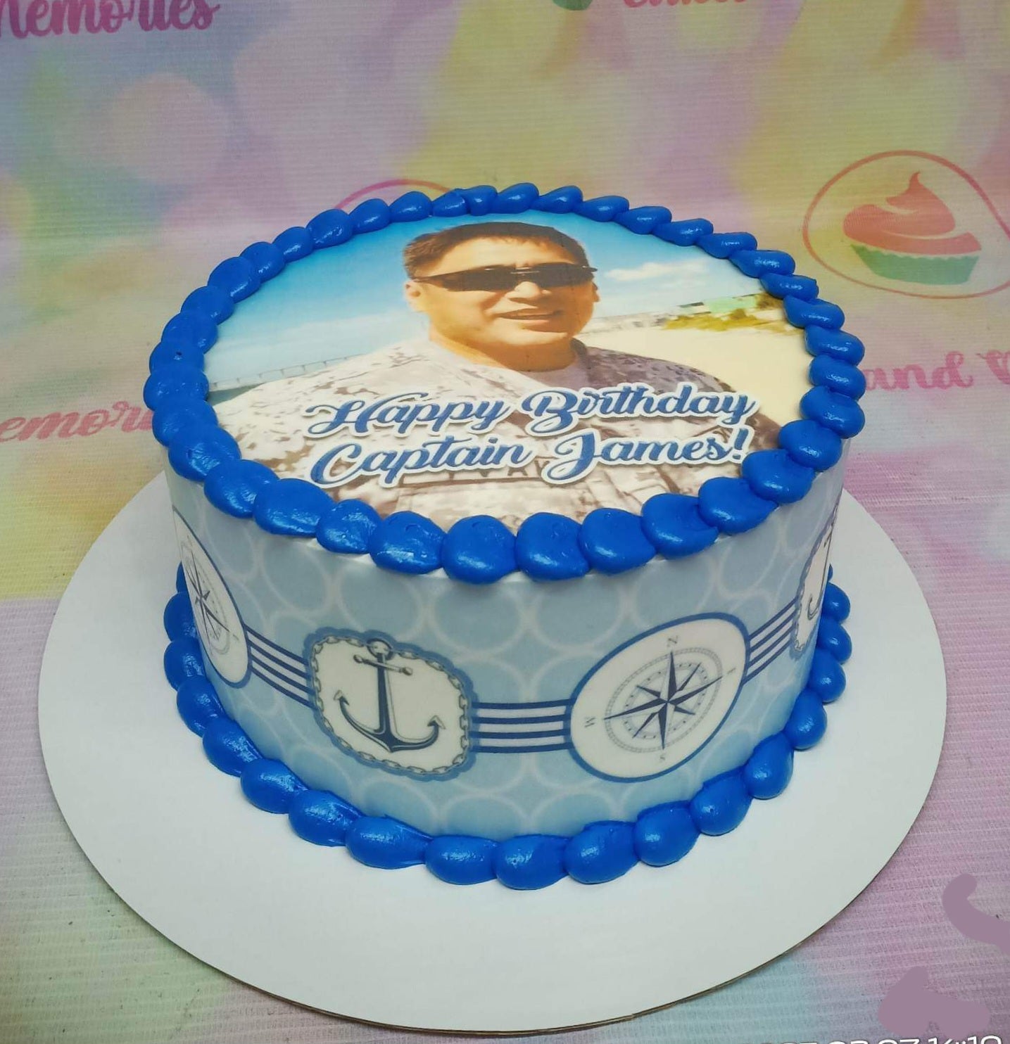 Blue and white nautical themed birthday cake with a photo print of a captain and blue icing borders.