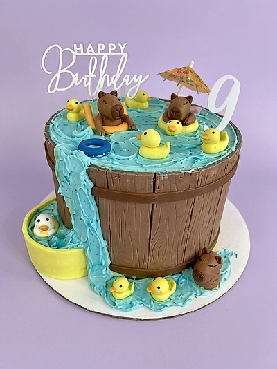 Capybara and rubber duck themed birthday cake designed like a wooden barrel with blue icing water and fondant animal figures.
