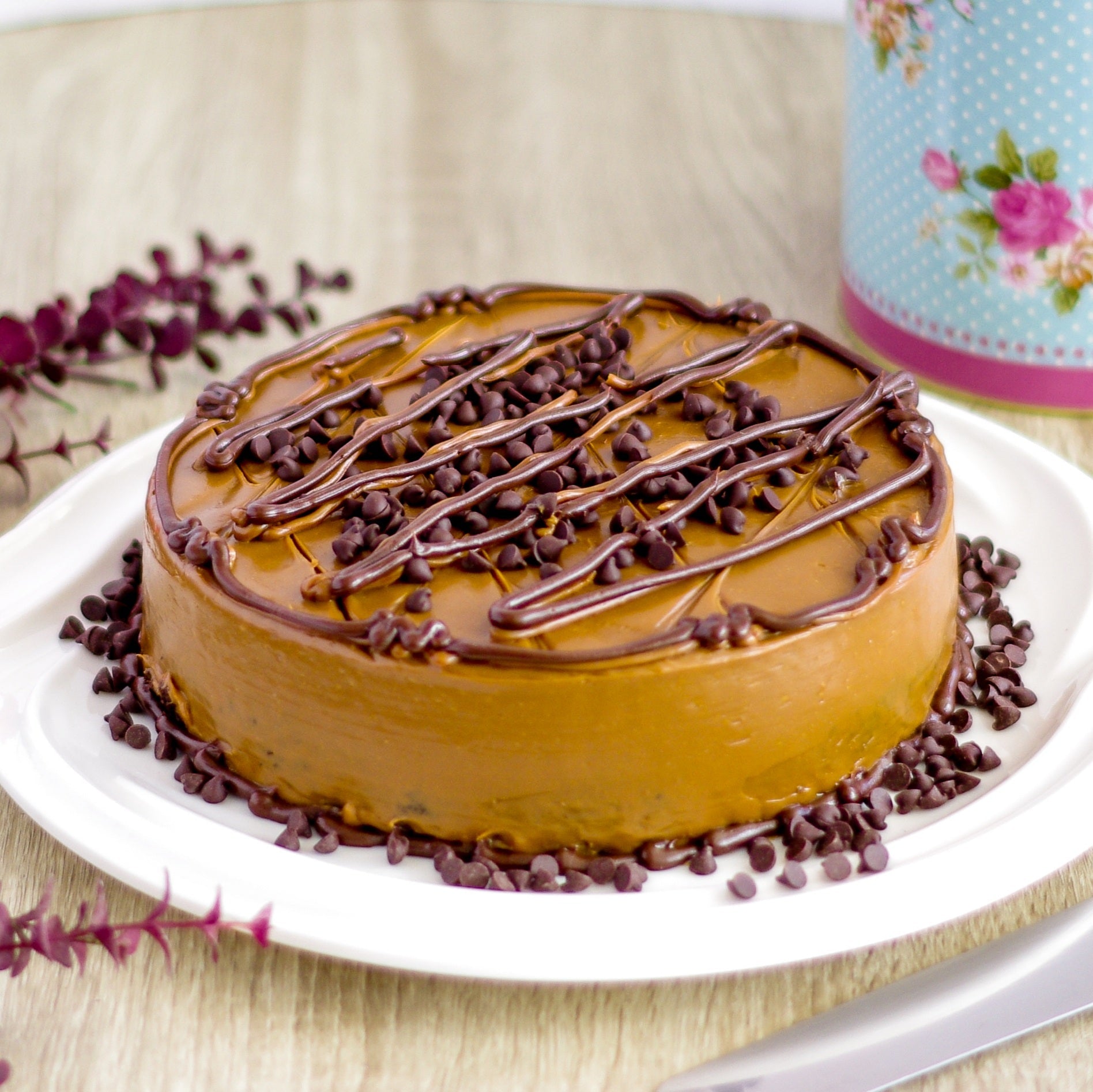 Round chocolate chip caramel cake with dark chocolate drizzle and mini chocolate chips on a white plate.