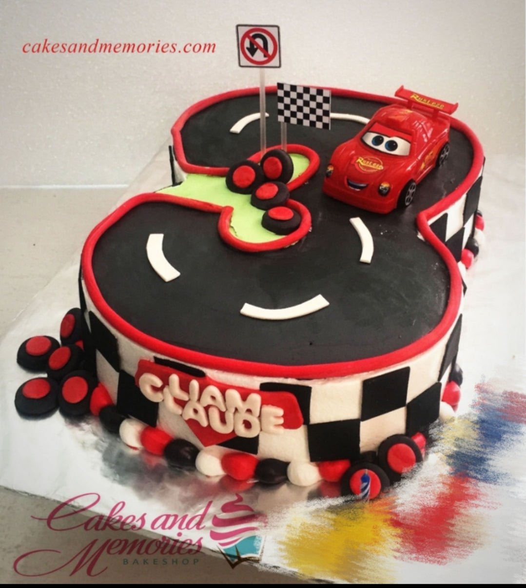 Number 8 shaped Cars themed birthday cake with Lightning McQueen toy car on a black fondant racetrack with checkered flag and road signs.