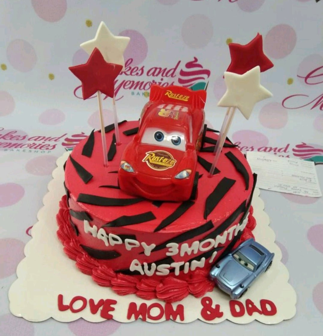 Red and black Lightning McQueen themed cake with toy cars and star toppers for a 3-month celebration.