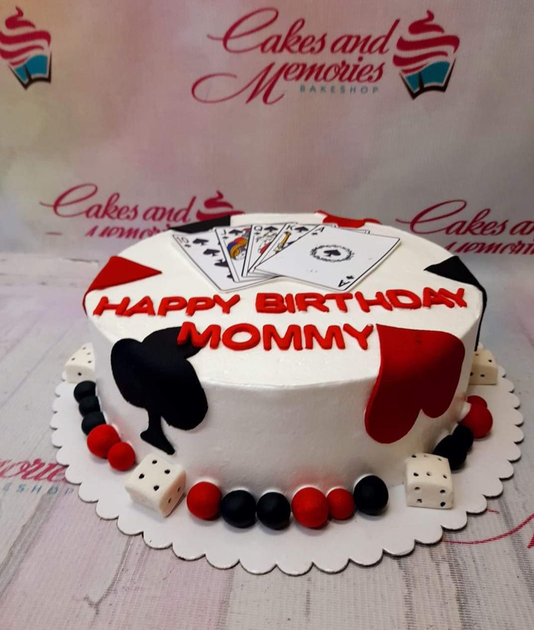 Casino themed birthday cake for Mommy with playing cards, dice, and card suit decorations in red, black, and white.