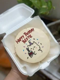 Minimalist bento cake with a hand-drawn white cat holding a small cake and 'Happy Budday Bestie' message in red icing.