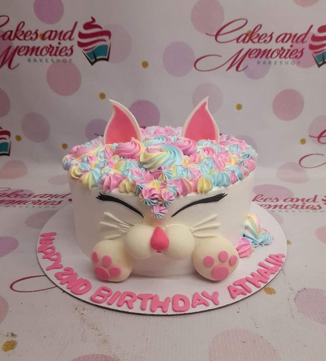 White cat-themed birthday cake with colorful pastel icing swirls, fondant ears, paws, and a pink nose.