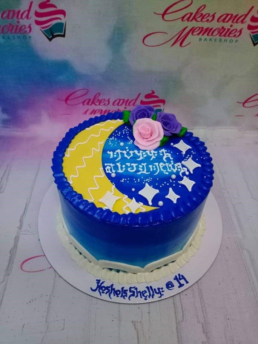Blue and yellow celestial cake with a crescent moon, stars, and pink and purple roses on top.