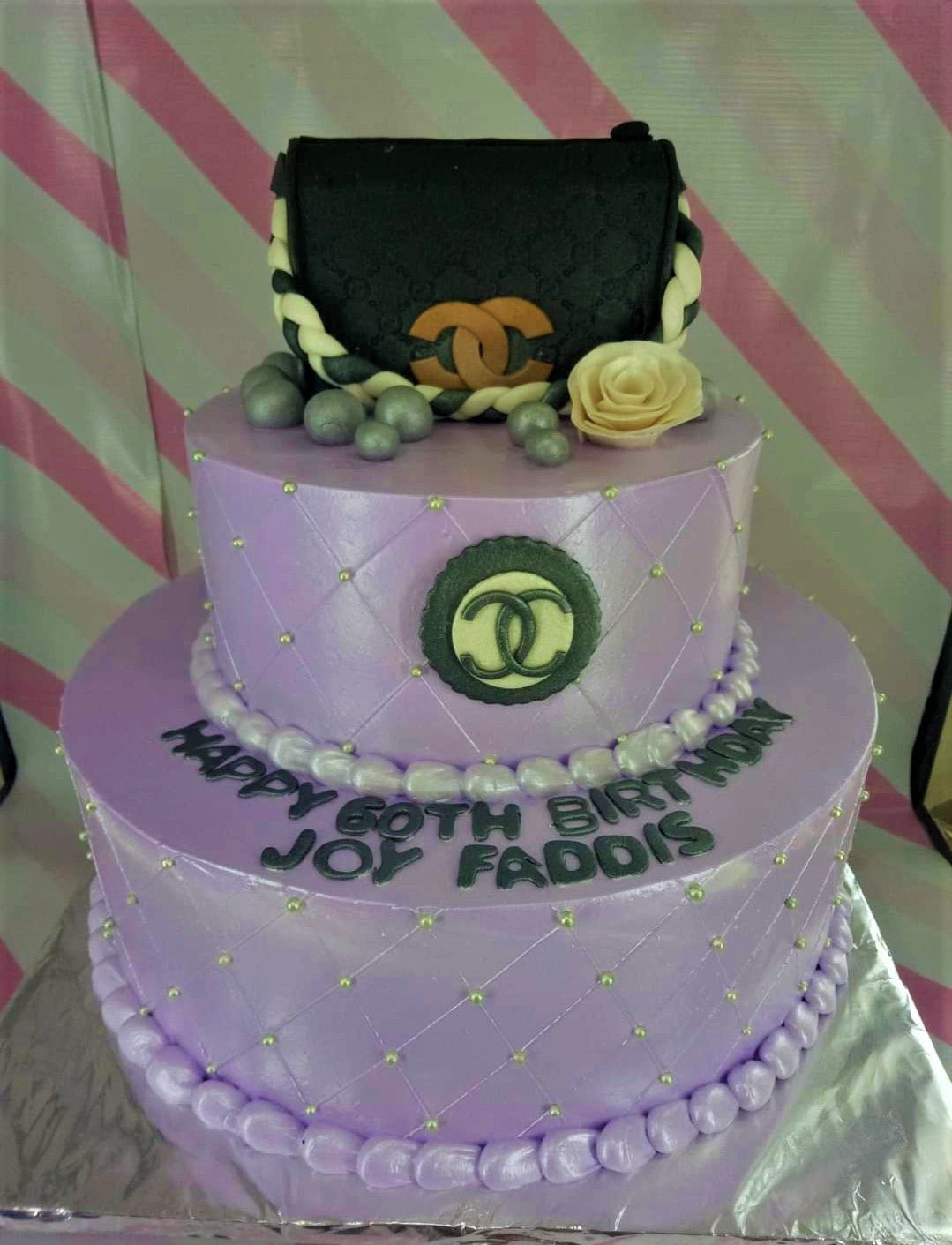 Two-tier lavender fondant cake with Chanel theme, featuring a black quilted handbag topper, pearl borders, and quilted side patterns.