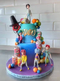 Two-tier blue gradient fondant cake with 3D character figures, soda cans, and colorful spheres.