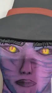 Purple character face cake with yellow eyes and a black hat with a red band.