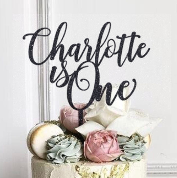 Elegant white birthday cake with gold leaf accents, pink and white flowers, and a black glittery Charlotte is One topper.
