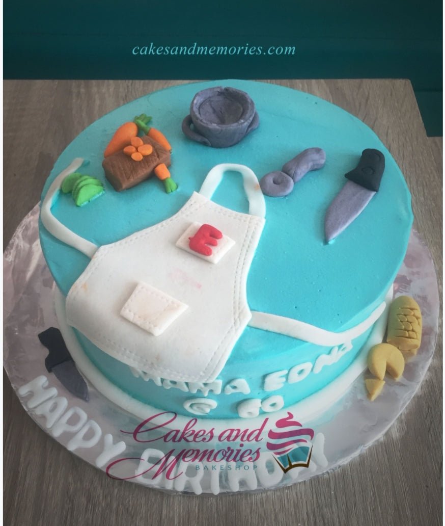 Light blue chef themed birthday cake with fondant apron, knife, and cooking utensils for Mama Edna's 60th birthday.