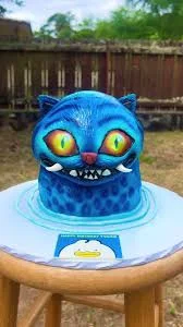 Blue Cheshire Cat sculpted fondant cake with glowing yellow eyes and sharp teeth on a light blue base board.