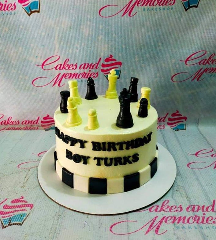 White single tier chess themed birthday cake with black and white fondant chess pieces and a checkered border.