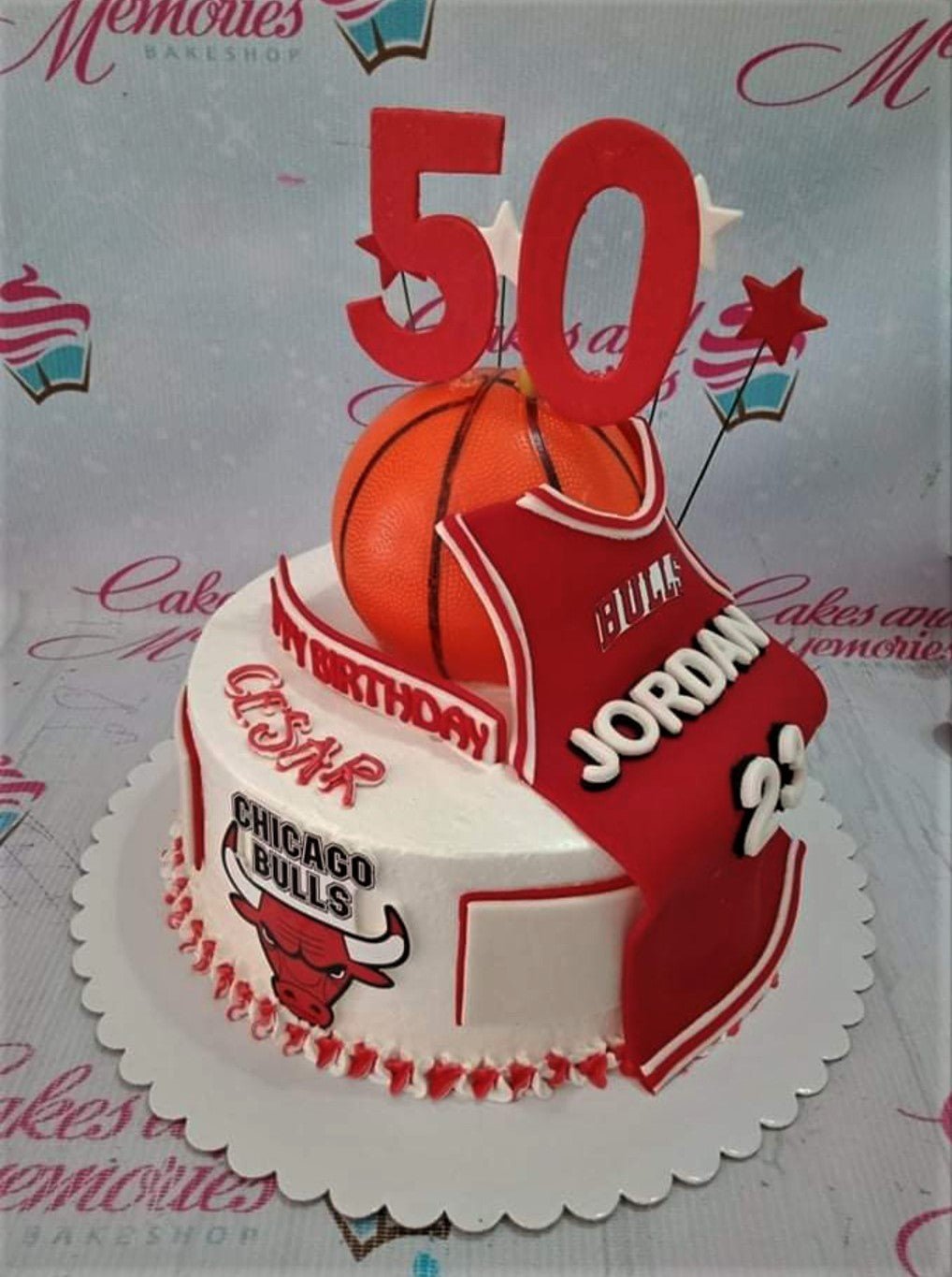 Chicago Bulls basketball themed birthday cake with a 3D basketball, jersey, and red number 50 topper.