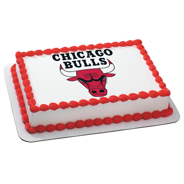 Rectangle Chicago Bulls themed cake with white icing, red shell borders, and a large central team logo printout.