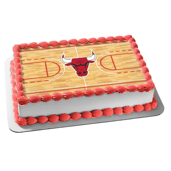 Chicago Bulls basketball court rectangle cake with red icing shell borders and a printed team logo center.