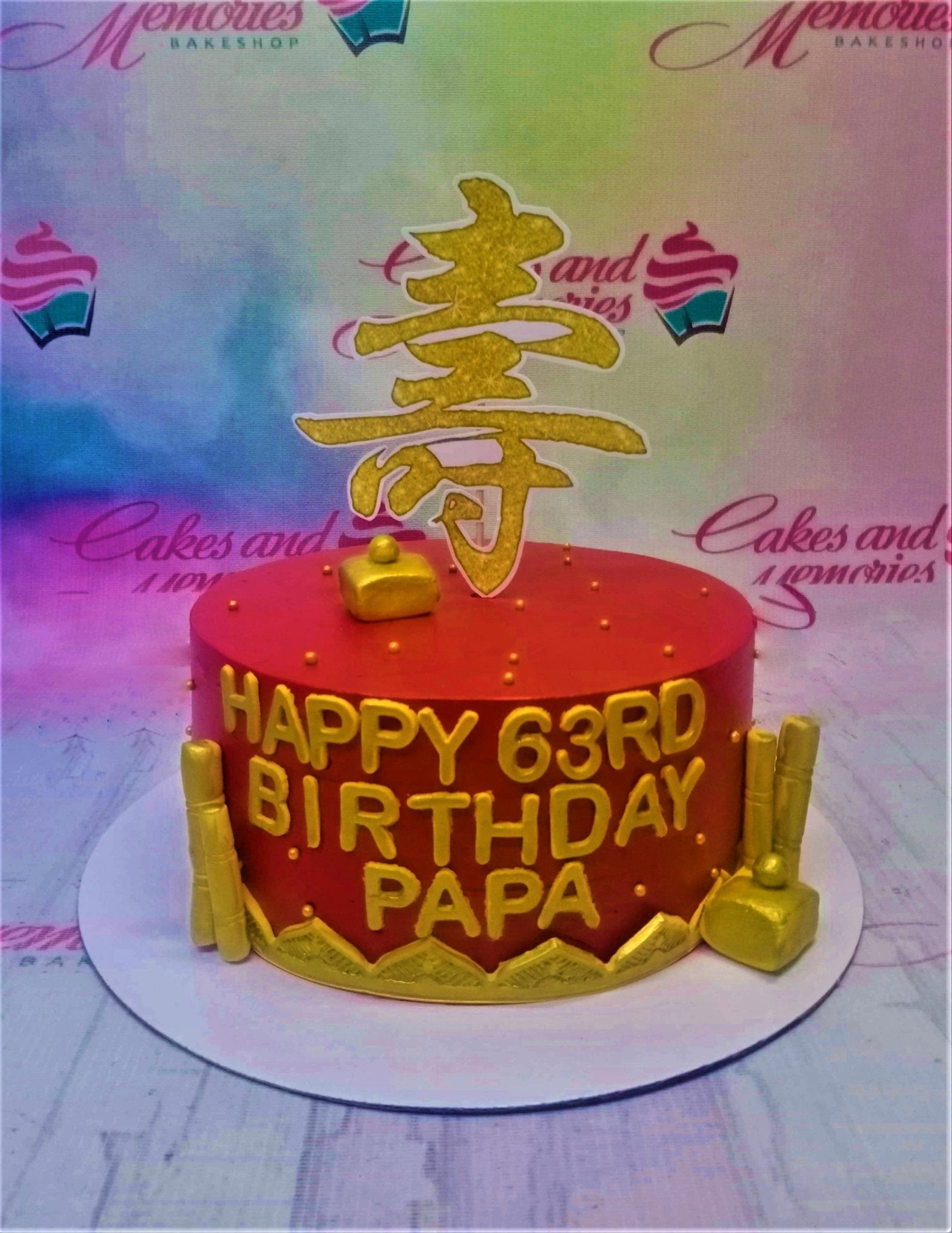 Red 1-tier birthday cake for Papa with gold Chinese longevity symbol topper and gold gumpaste bamboo and hammer decorations.