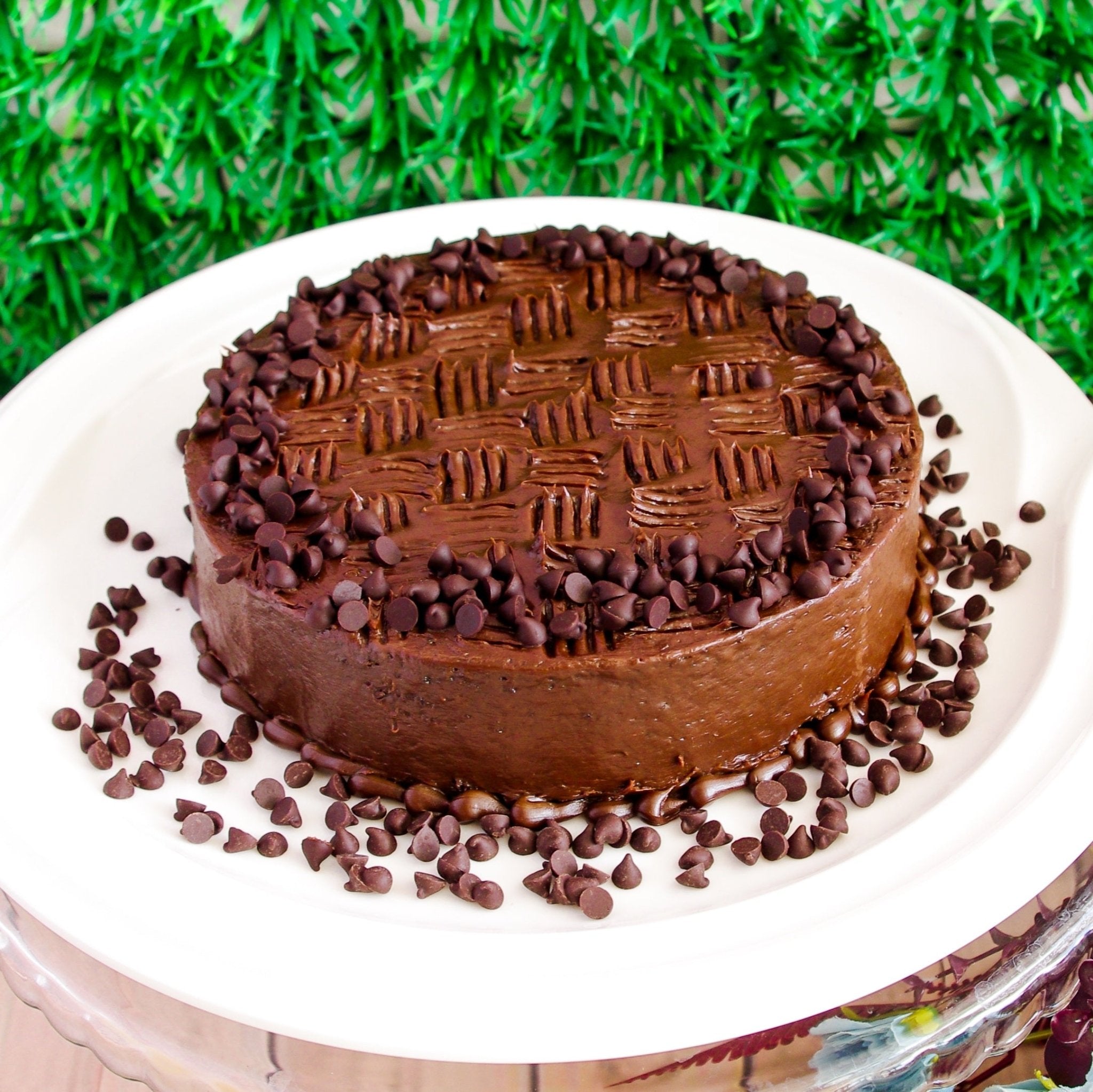 Round chocolate cake with dark chocolate icing, basketweave texture on top, and chocolate chips around the edges and base.