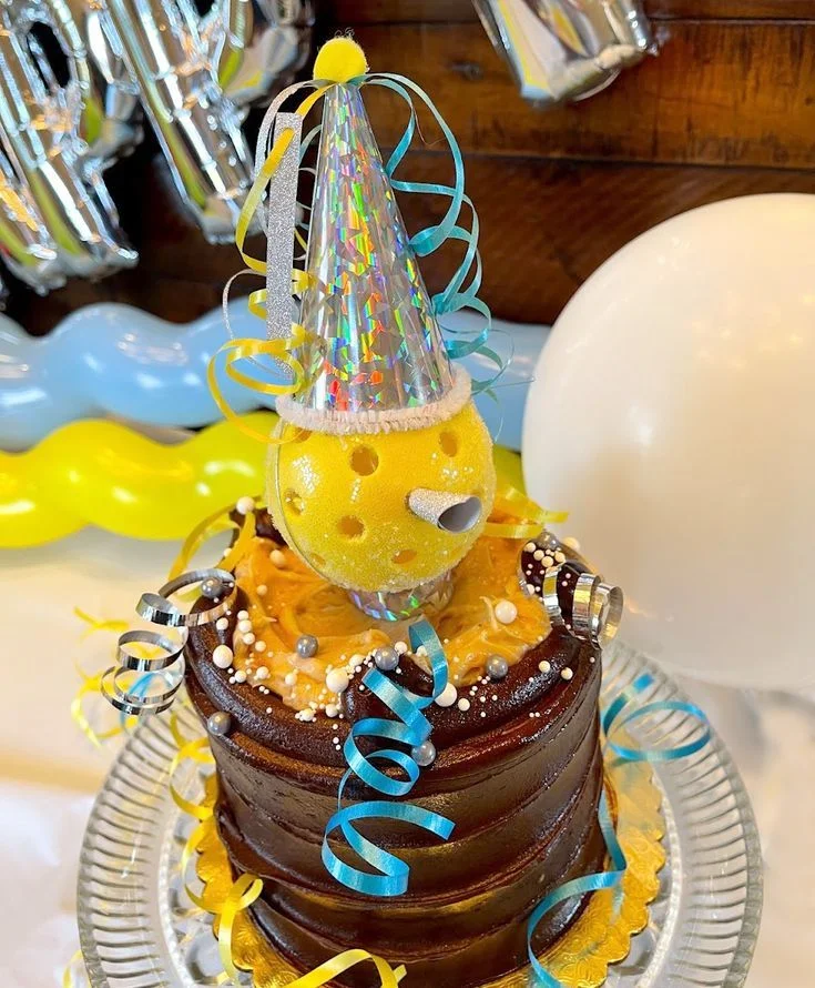 Chocolate cake with yellow icing top, silver and white sprinkles, and a yellow ball topper wearing a silver party hat.