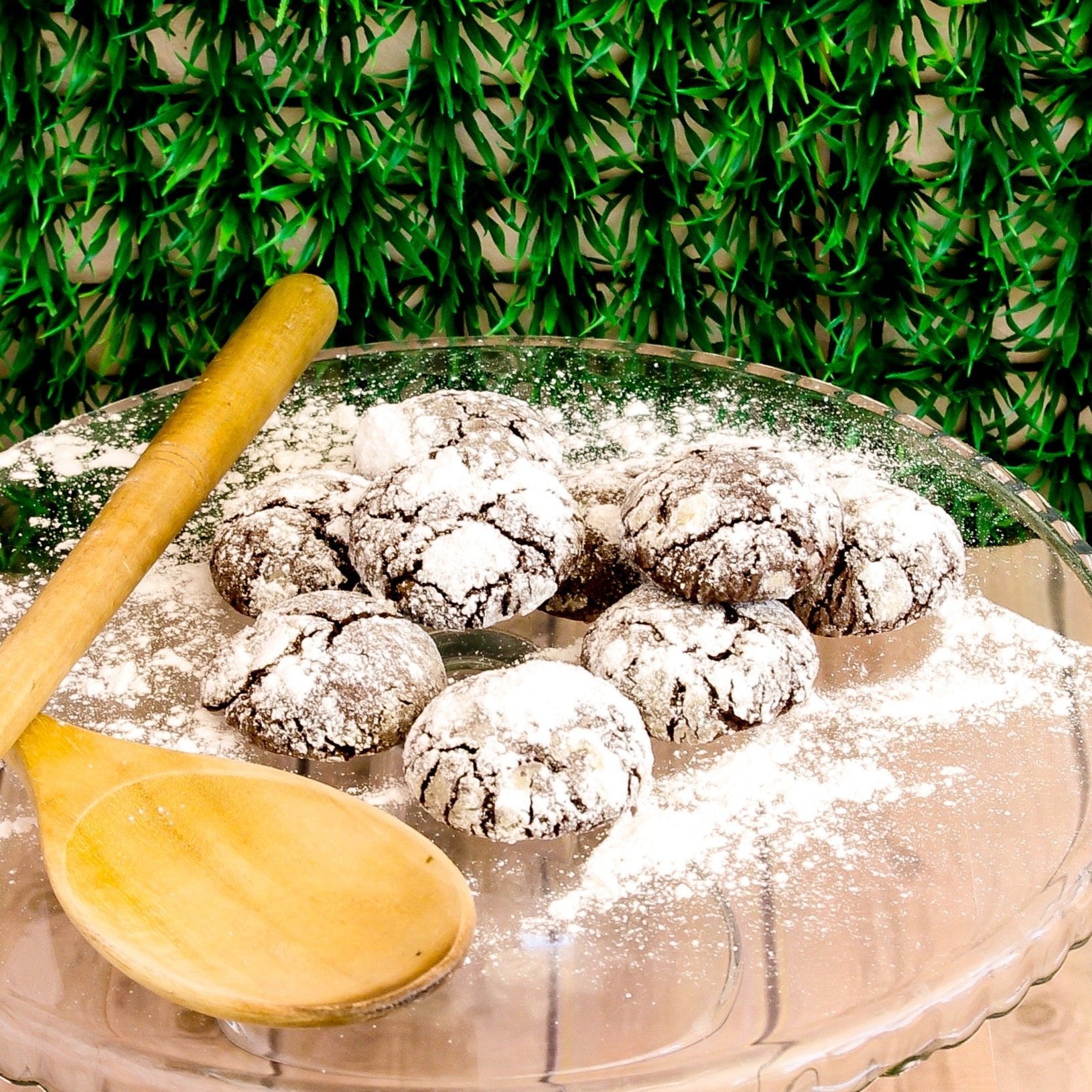 This image features a collection of chocolate crinkle cookies, which are not a traditional cake but a popular dessert choice.