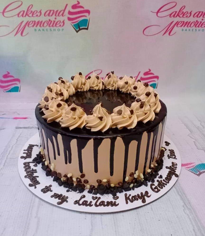 Chocolate drip cake with tan icing rosettes and chocolate chips on a white base board with a birthday message.