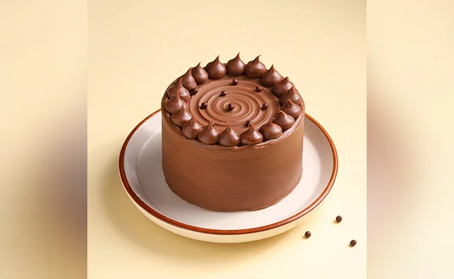 Minimalist chocolate cake with smooth brown icing, piped chocolate dollops, and dark chocolate pearls on top.