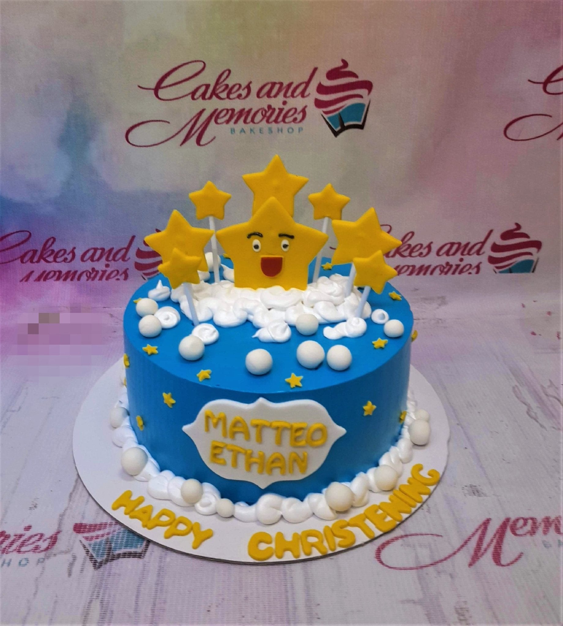 Blue christening cake with yellow star toppers and white icing clouds